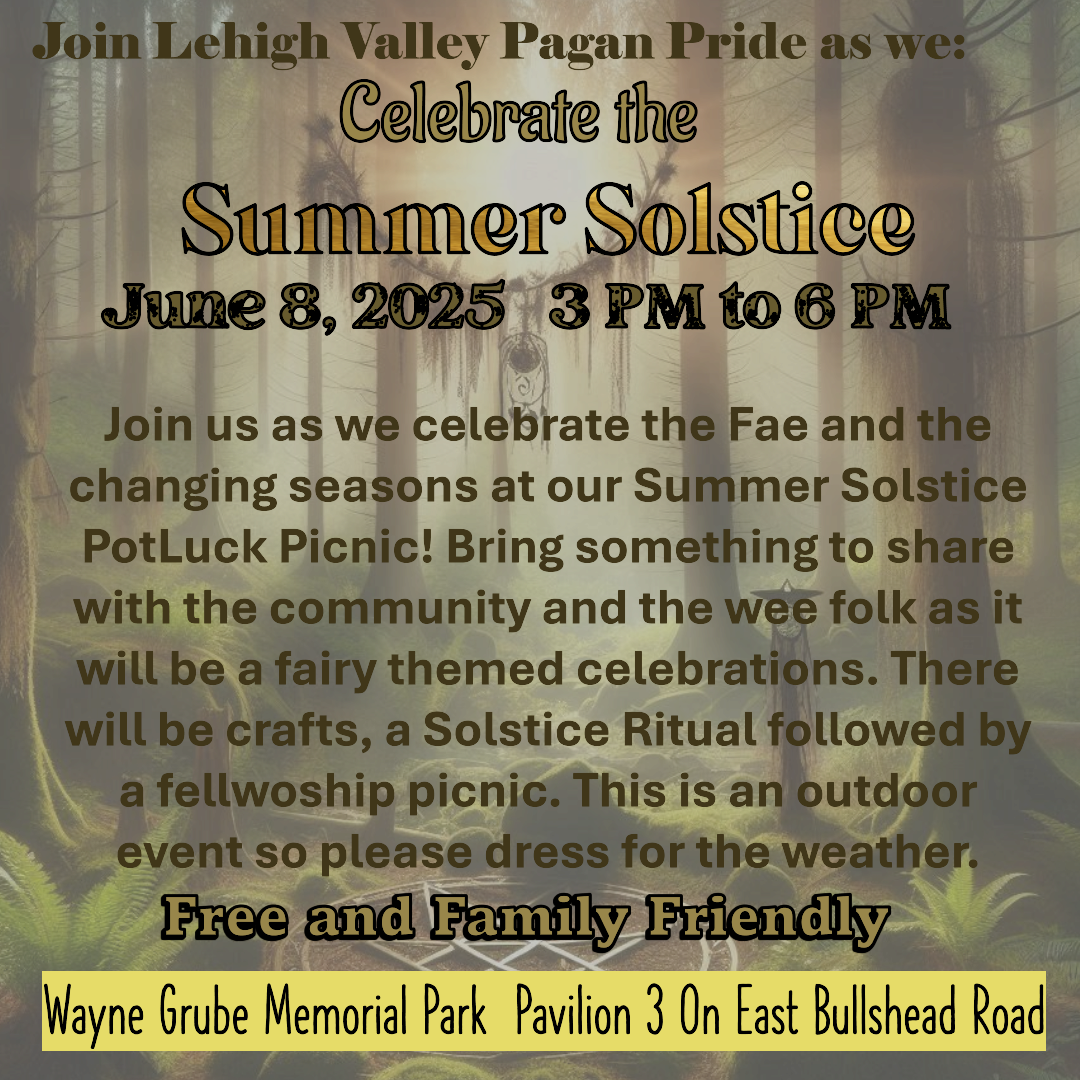 Join us as we celebrate the Fae and the changing of the seasons at our Summer Solstice Potluck Picnic! The event is free to attend and family friendly. Bring something to share with the community and the wee folk, as it will be a fairy themed celebration. There will be crafts, a Solstice Ritual, and gathering after. Please dress for the weather as this is an outdoor event. All craft supplies will be provided. As always the event is free and Family -Friendly.